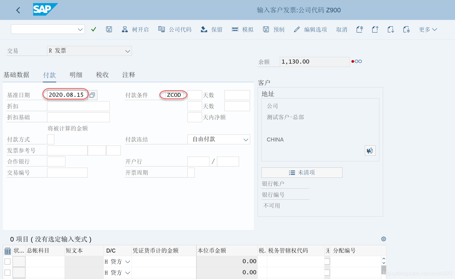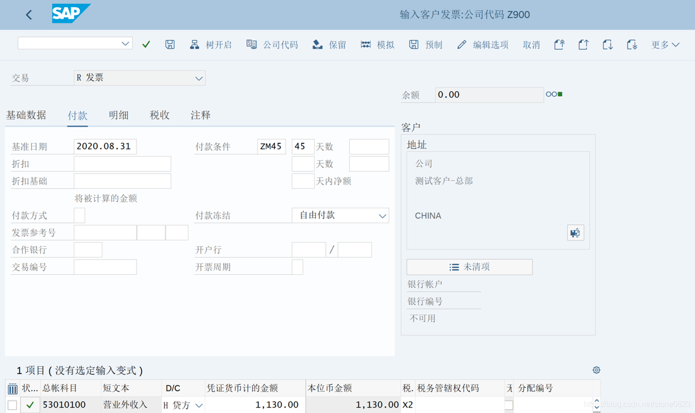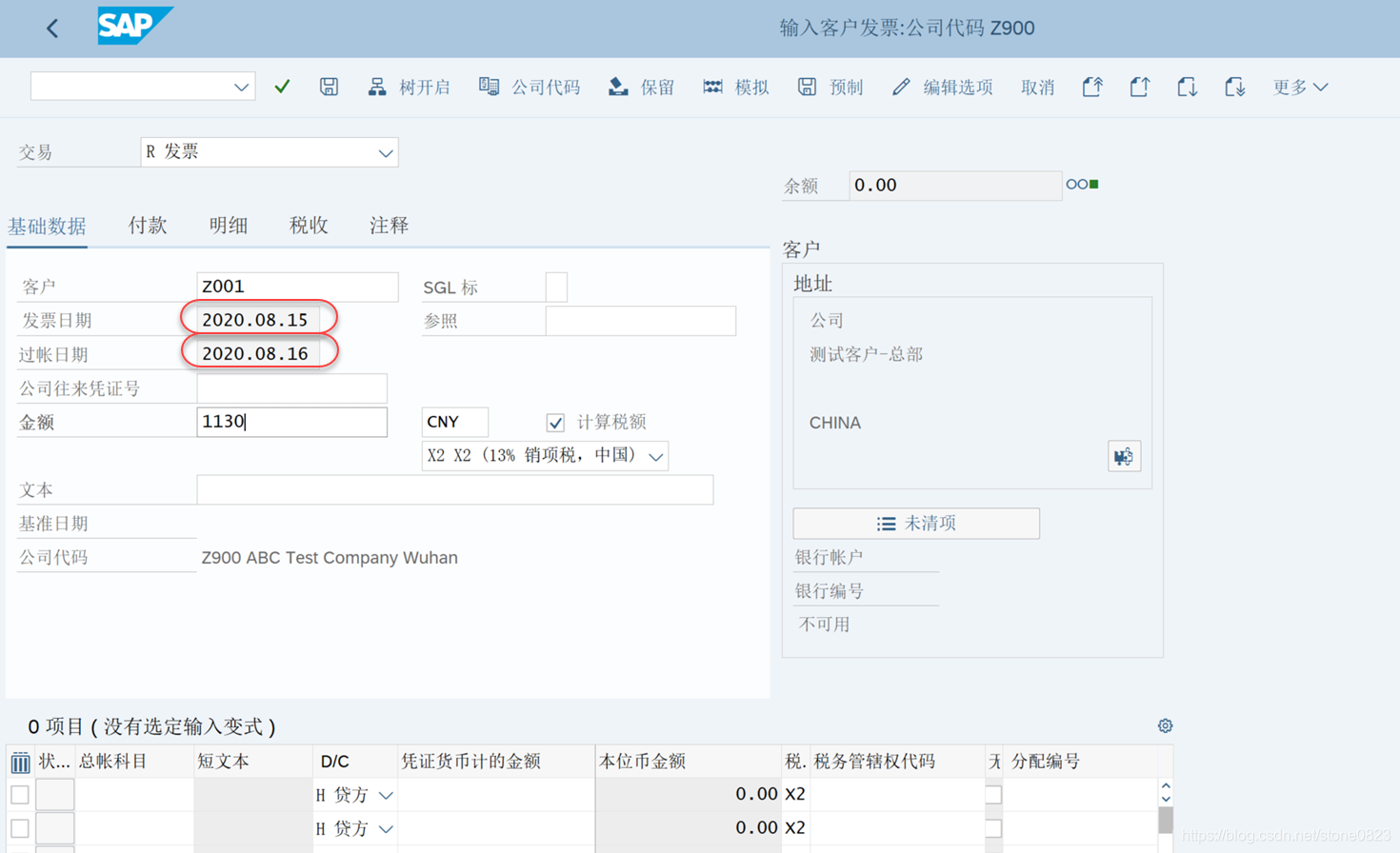 通过 FB70 录入一张手工发票,发票日期为 2020/8/15,过账日期为 2020/8/16,两个日期不同,更容易看出付款条件基于发票日期作为基准日期。