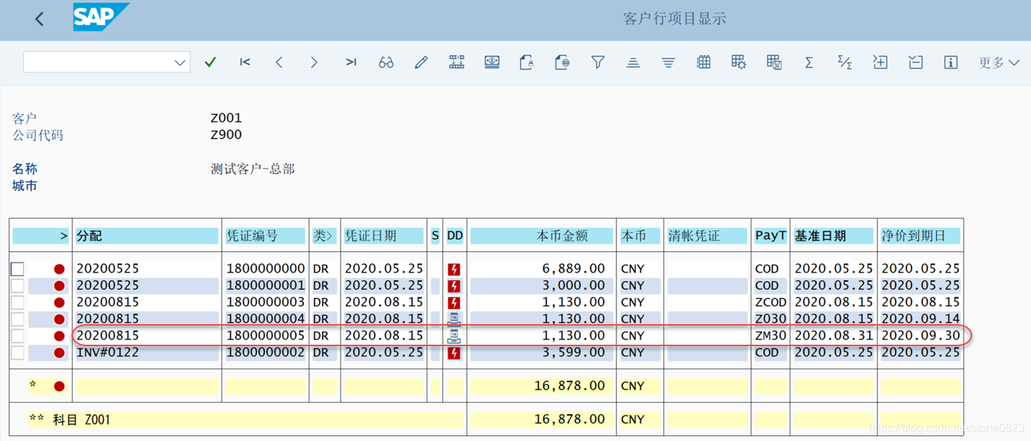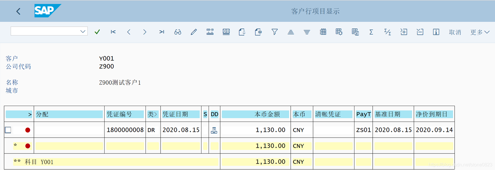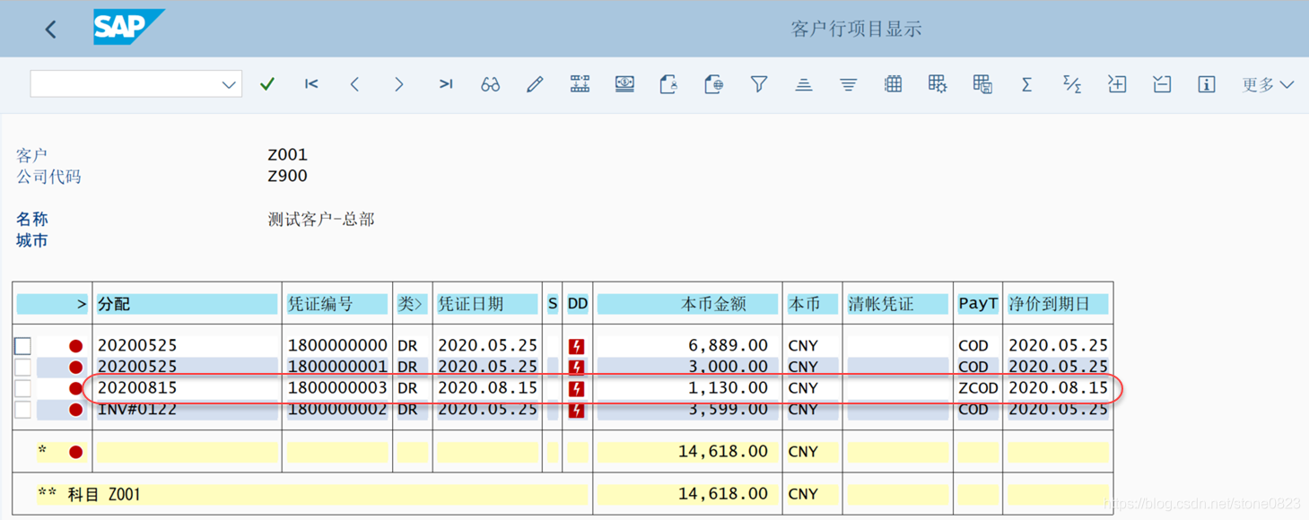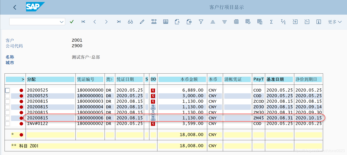 保存会计凭证,通过事务码 FBL5N 查看该笔应收账款的到期日与凭证日期相同,为 8/15: