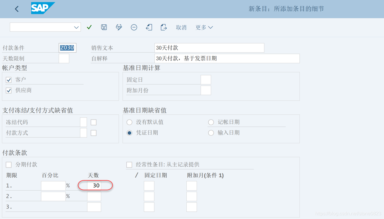 假设到期日是基于发票日期后 30 天到期,新建一个付款条件 Z030,配置的界面如下:
