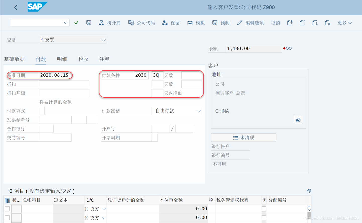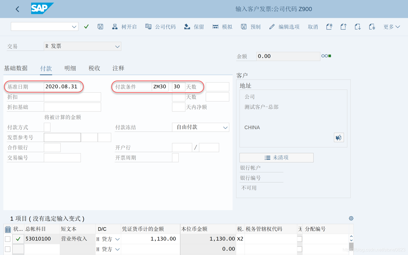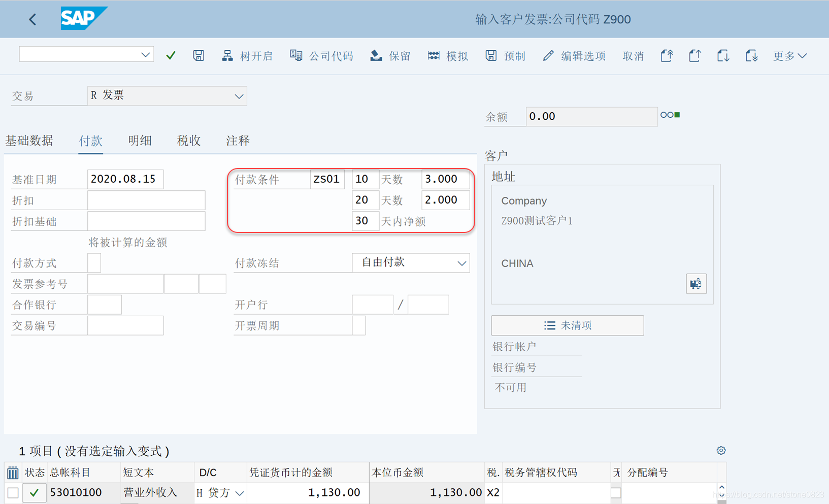 将天数设为 30 即可。如果有基于 45 天 付款的,60 天付款的,与此类似。使用事务码 FB70,录入相同的发票,客户 Z001 选择的付款条件为 Z030,付款页签的界面如下: