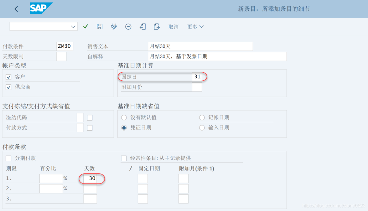 月结 30 天的意思是,不管是 1 号的发票还是 25号的发票,都以月份为基础,30 天后到期。配置的方法是:把基准日期计算部分的固定日设置为 31,付款条件部分的日期设置为 30,如下图所示: