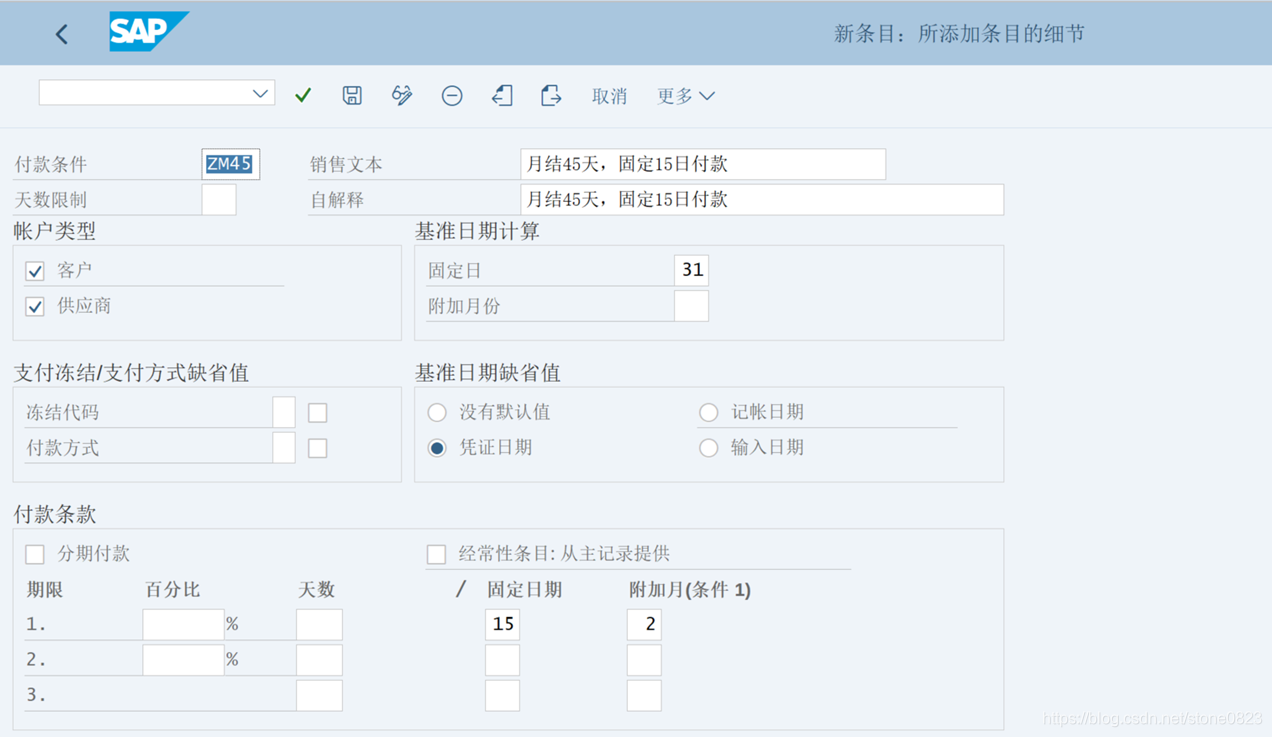 有些公司对付款条件作了额外的限定,比如每月统一日期安排付款,下面以月结 45 天,固定 15 号付款为例。SAP 也支持这种付款条件的配置: