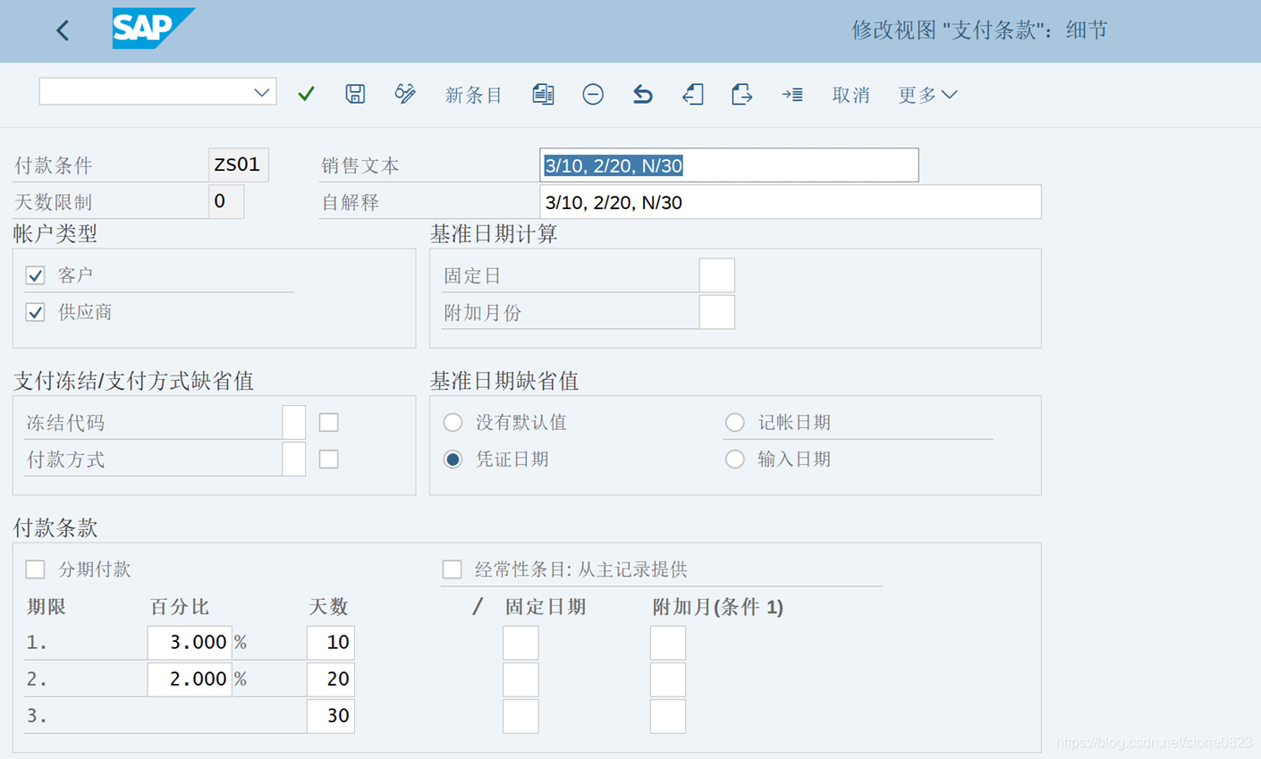 3/10, 2/20, N/30 表示 10 天之内付款折扣 3%,20 天内付款折扣 2%,最长不超过 30 天。SAP 支持这种带折扣的付款条件,配置界面如下: