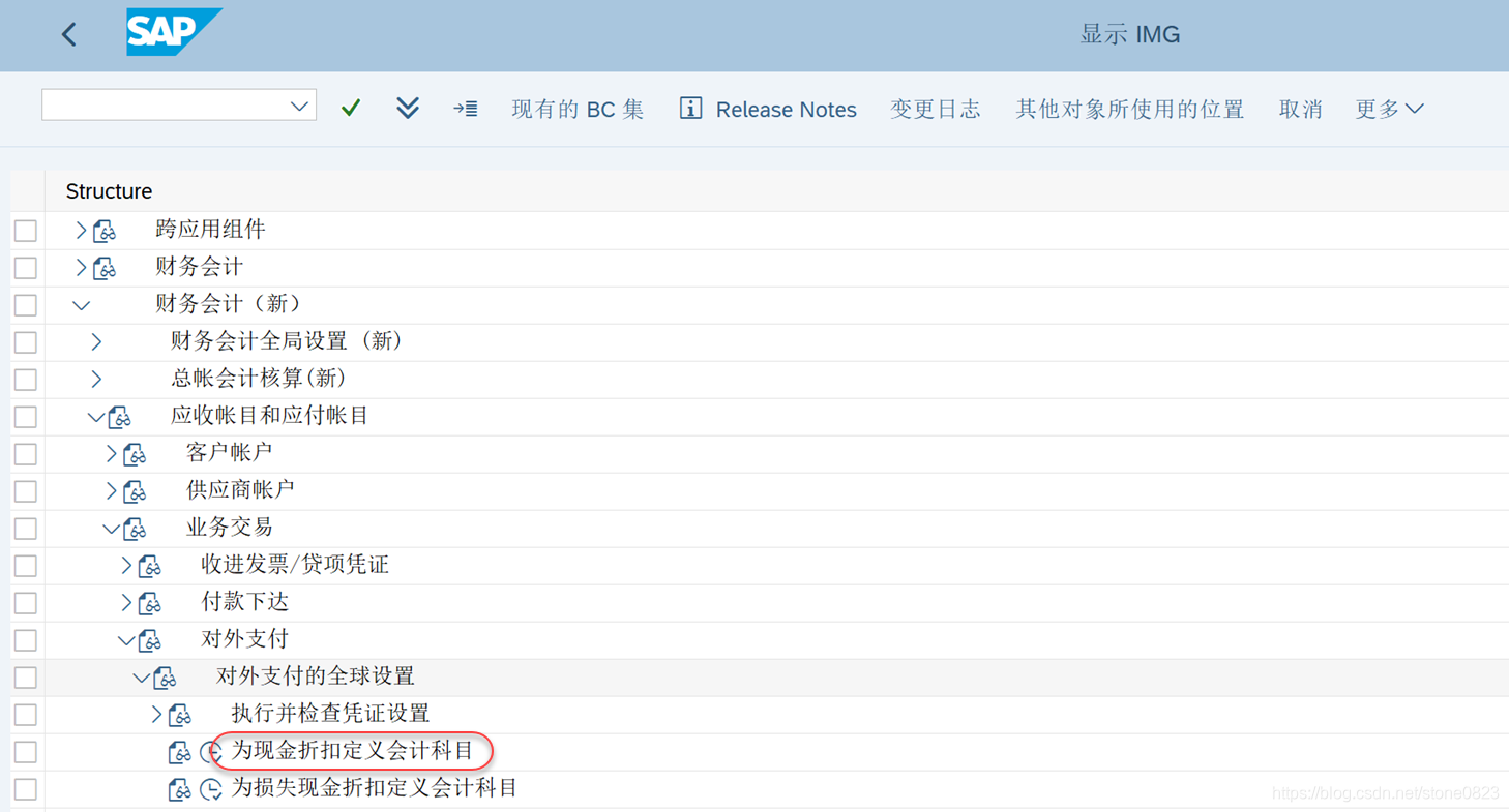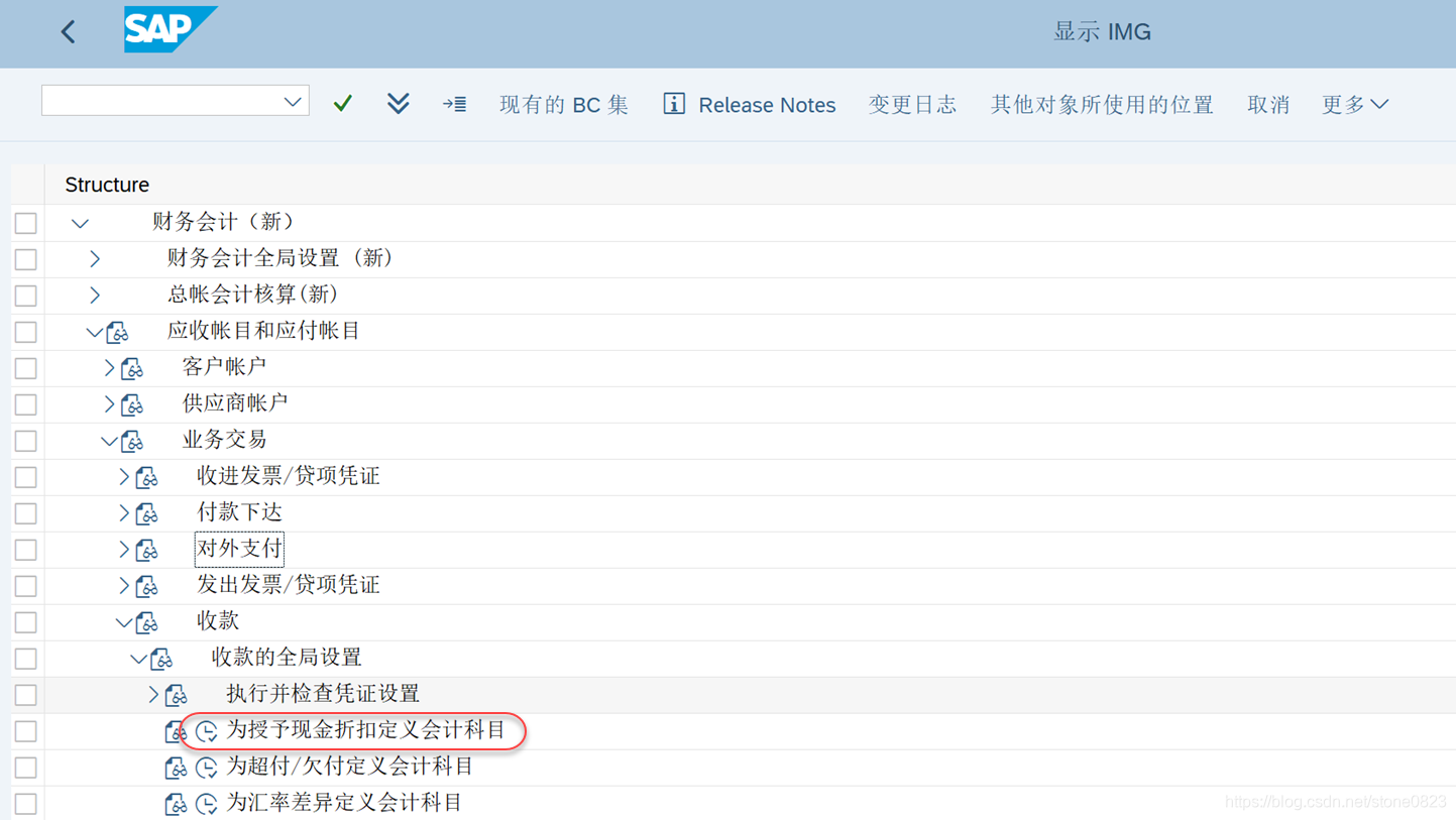 因为付款条件与折扣相关,还需要配置折扣自动记账科目,客户和供应商需要分别配置。在下面的路径配置客户的收款享受到的折扣 (事务码 OBXI):