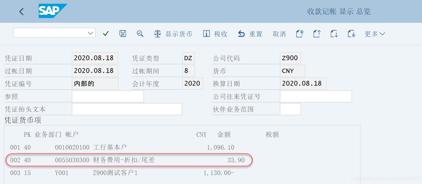 基准日期为 8/15,到期日按 30 天计算,9/14 日到期。接下来,测试 10 天之内收款,使用事务码 F-28 收款: